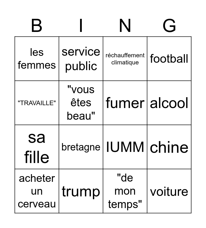 This bingo card has 16 words: trump, chine, réchauffement climatique, les femmes, sa fille, service public, IUMM, "de mon temps", "TRAVAILLE", "vous êtes beau", acheter un cerveau, football, bretagne, alcool, fumer and voiture.
