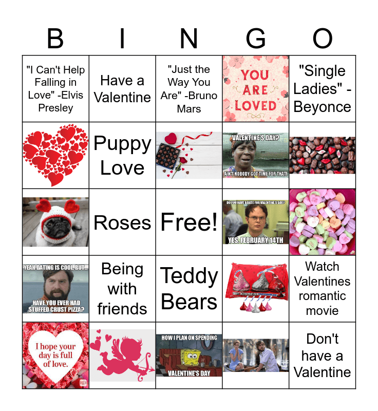 This bingo card has 25 images, a free space and 24 words: Have gotten the Chick- Fil-A Valentines day platter, Have gotten a box of chocolates on Valentines day, Spent Valentines day watching netflix, Have a Valentine, Candy hearts, Best Friend, Roses, Don't have a Valentine, Affection:), Eat an unhealthy amount of chocolate, "Just the Way You Are" -Bruno Mars, "I Can't Help Falling in Love" -Elvis Presley, "Single Ladies" -Beyonce, Being alone, Being with friends, Watch Valentines comedy movie, Watch Valentines romantic movie, Valentines, Teddy Bears, Love Notes, Friends, Hugs, Cards and Puppy Love.