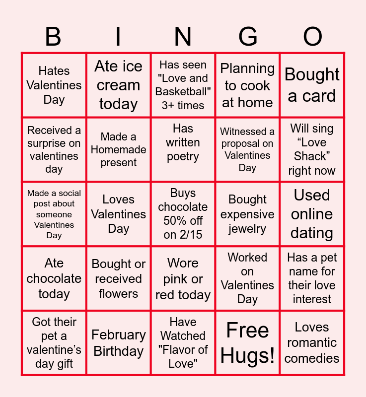 This bingo card has 30 words: February Birthday, Never had a valentine, Loves Valentines Day, Been in a relationship for 5+ years, Hates Valentines Day, Has seen "Love and Basketball" 3+ times, Made a Homemade present, Wore pink or red today, Bought expensive jewelry, Have Watched "Flavor of Love", Used online dating, Buys chocolate 50% off on 2/15, Free Hugs!, Loves romantic comedies, Will sing “Love Shack” right now, Has a secret admirer, Worked on Valentines Day, Ate chocolate today, Bought or received flowers, Bought a card, Made a social post about someone Valentines Day, Doesn't have a plan yet for Valentines Day, Ate ice cream today, Witnessed a proposal on Valentines Day, Received a surprise on valentines day, Planning to cook at home, Has a pet name for their love interest, Got their pet a valentine’s day gift, Has written poetry and Has a heart / love tattoo.