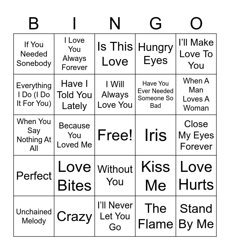 This bingo card has a free space and 74 words: Heaven, When I See You Smile, Is This Love, To Be With You, When I Look Into Your Eyes, Missing You, I Don’t Want To Miss A Thing, More Than Words, Unchained Melody, Always, I Want To Know What Love Is, Love Is On The Way, I Will Always Love You, Everything I Do (I Do It For You), Wonderful Tonight, Because You Loved Me, I Just Called To Say I Love You, When A Man Loves A Woman, My Girl, When You Say Nothing At All, Have I Told You Lately, I Love You Always Forever, Hungry Eyes, I’m Yours, Stand By Me, Amazed, Listen To Your Heart, Just The Way You Are, I Swear, Eternal Flame, I’ll Make Love To You, Take My Breath Away, I’ll Be There For You, Lost In Love, Keep On Loving You, The Flame, Faithfully, Glory Of Love, I’ll Be, Can’t Fight This Feeling, I’ll Never Let You Go, Crazy, The Search Is Over, Take Me Home Tonight, Love Song, If You Needed Sonebody, Angel, Love Bites, Never Say Goodbye, Don’t Know What You’ve Got (Til It’s Gone), I’d Do Anything For Love (But I Won’t Do That), I Remember You, Close My Eyes Forever, Alone, Lips Of An Angel, Amanda, Without You, I Won’t Forget You, The Ballad Of Jayne, Love Hurts, Have You Ever Needed Someone So Bad, My Boo, Perfect, Marry Me, Iris, I Get To Love You, Speechless, Marry You, Kiss Me, Careless Whisper, All For Love, You’re The Inspiration, (I Can’t Help) Falling In Love With You and A Groovy Kind Of Love.