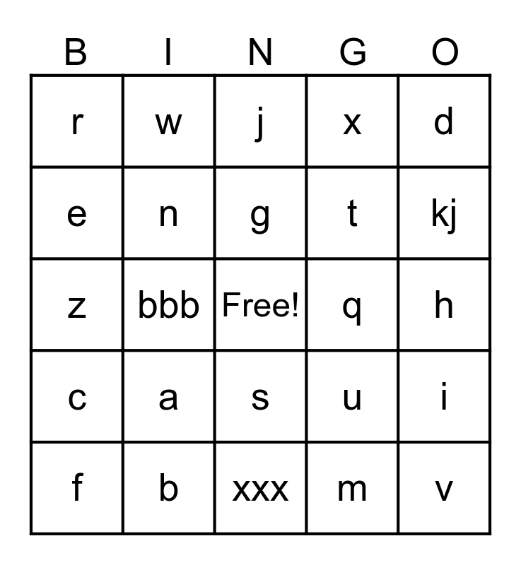 This bingo card has a free space and 24 words: a, b, g, f, d, r, e, w, q, s, t, z, u, i, n, m, h, j, kj, bbb, v, c, x and xxx.
