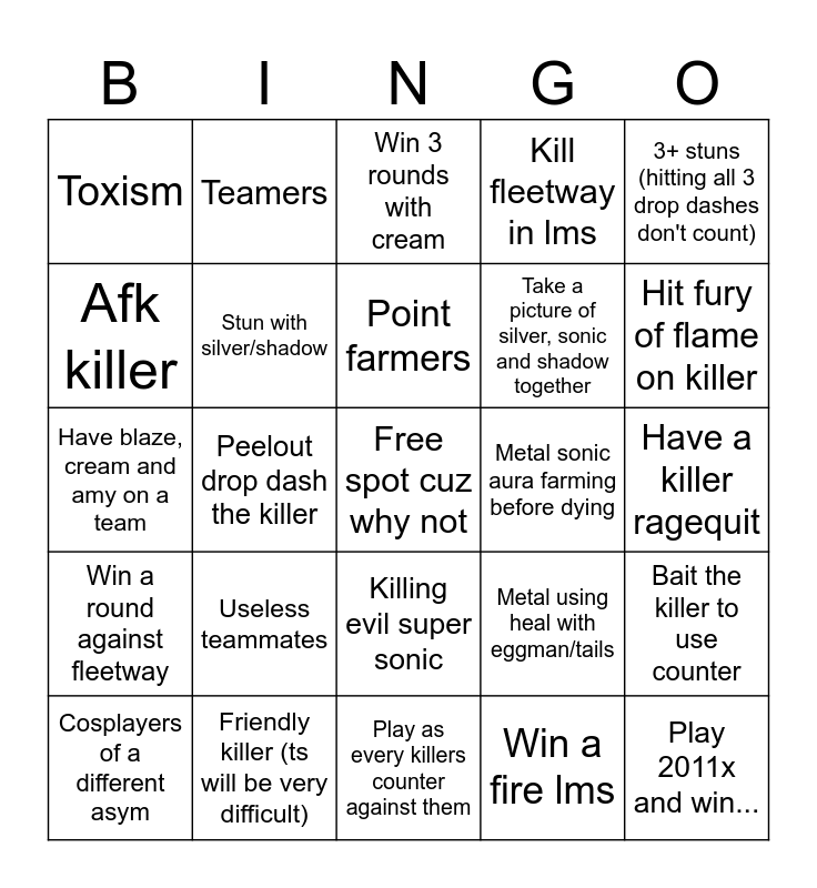 This bingo card has a free space and 24 words: Useless teammates, Friendly killer (ts will be very difficult), Point farmers, Cosplayers of a different asym, 3+ stuns (hitting all 3 drop dashes don't count), Toxism, Afk killer, Teamers, Metal sonic aura farming before dying, Killing evil super sonic, Take a picture of silver, sonic and shadow together, Have blaze, cream and amy on a team, Metal using heal with eggman/tails, Bait the killer to use counter, Stun with silver/shadow, Win a fire lms, Have a killer ragequit, Win 3 rounds with cream, Hit fury of flame on killer, Peelout drop dash the killer, Play 2011x and win..., Win a round against fleetway, Kill fleetway in lms and Play as every killers counter against them.