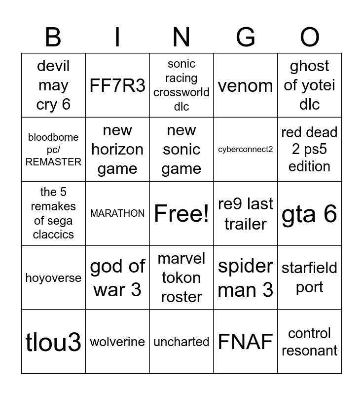 This bingo card has a free space and 24 words: god of war 3, wolverine, new sonic game, tlou3, ghost of yotei dlc, devil may cry 6, bloodborne pc/ REMASTER, FF7R3, re9 last trailer, marvel tokon roster, cyberconnect2, the 5 remakes of sega claccics, spider man 3, starfield port, new horizon game, FNAF, gta 6, sonic racing crossworld dlc, red dead 2 ps5 edition, MARATHON, control resonant, hoyoverse, venom and uncharted.