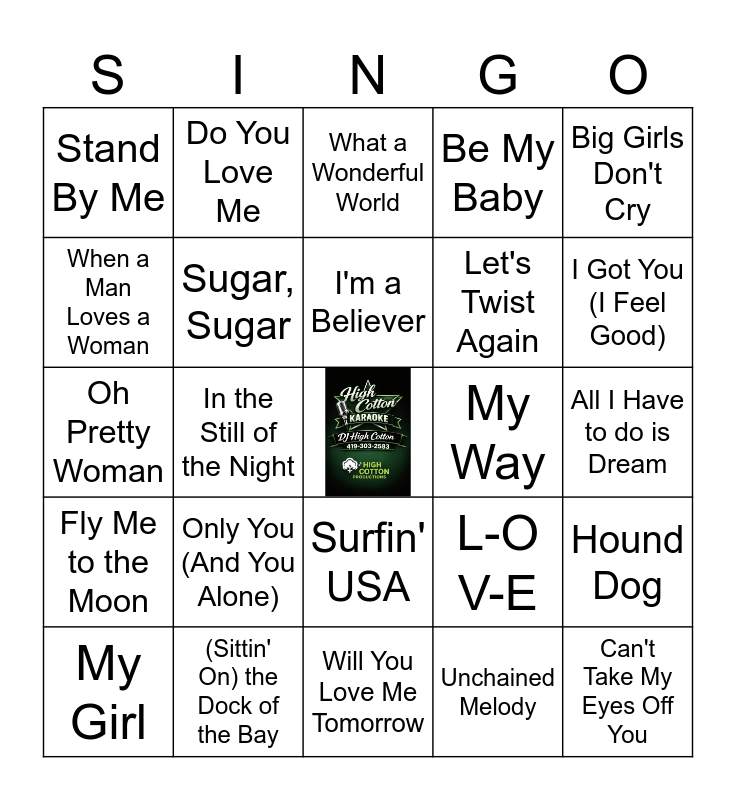 This bingo card has a free space and 24 words: Only You (And You Alone), (Sittin' On) the Dock of the Bay, I'm a Believer, My Girl, Big Girls Don't Cry, Stand By Me, When a Man Loves a Woman, Do You Love Me, My Way, Surfin' USA, Let's Twist Again, Oh Pretty Woman, L-O V-E, Hound Dog, Sugar, Sugar, Unchained Melody, All I Have to do is Dream, What a Wonderful World, I Got You (I Feel Good), In the Still of the Night, Can't Take My Eyes Off You, Fly Me to the Moon, Be My Baby and Will You Love Me Tomorrow.