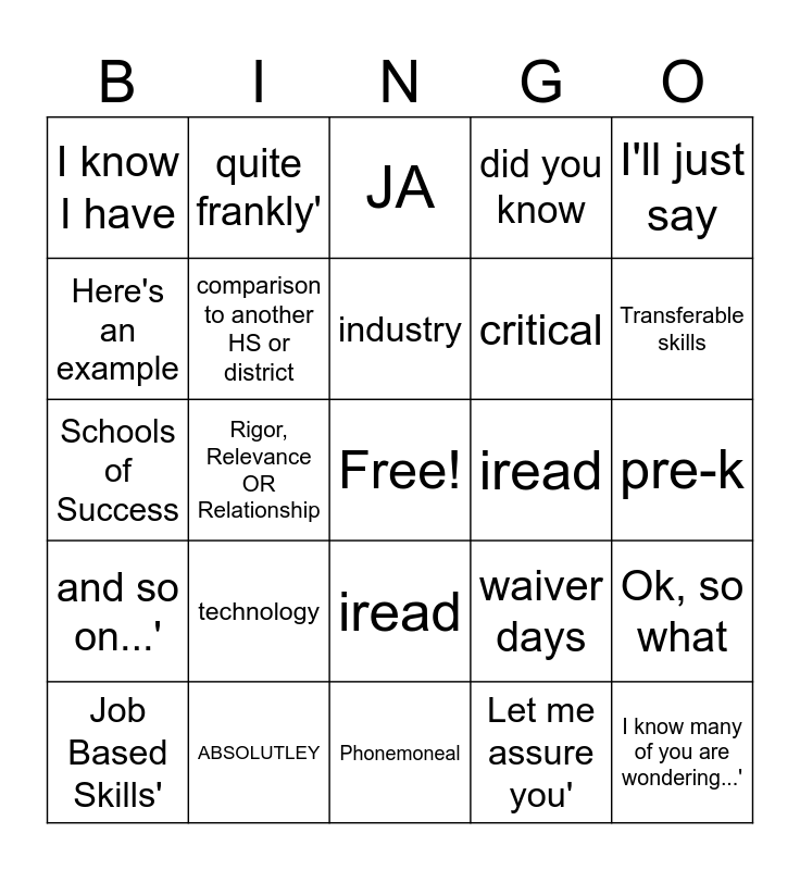 This bingo card has a free space and 62 words: 3DE, ABSOLUTLEY, AmpLab, and so on...', AP' or 'Dual Credit', By Golly, comparison to another HS or district, COMPETENCIES, critical, DATA (with emphasis), did you know, far superior, Here's an example, how many of you', I can tell you, I know I have, I know many of you are wondering...', I'll just say, ie, industry, iread, JA, Job Based Skills', Let me assure you', listing things, market driven system, New fancy FWCS intro or animation, Northeast Indiana Economy', Ok, so what, One more thing, partnerships, Phonemoneal, Pipeline, portrait of...., pre-k, quite frankly', random theoretical student journey, Real world careers', Rigor, Relevance OR Relationship, says 'network', Schools of Success, talking to other superintendents, technology, to say the least, Transferable skills, waiver days, well folks, What is our Y, Answers his own rhetorical question, Phonemoneal, iread, Phonemoneal, pre-k, Ok, so what, DATA (with emphasis), market driven system, I'll just say, ie, what is our Y, critical, AP' or 'Dual Credit' and By Golly.