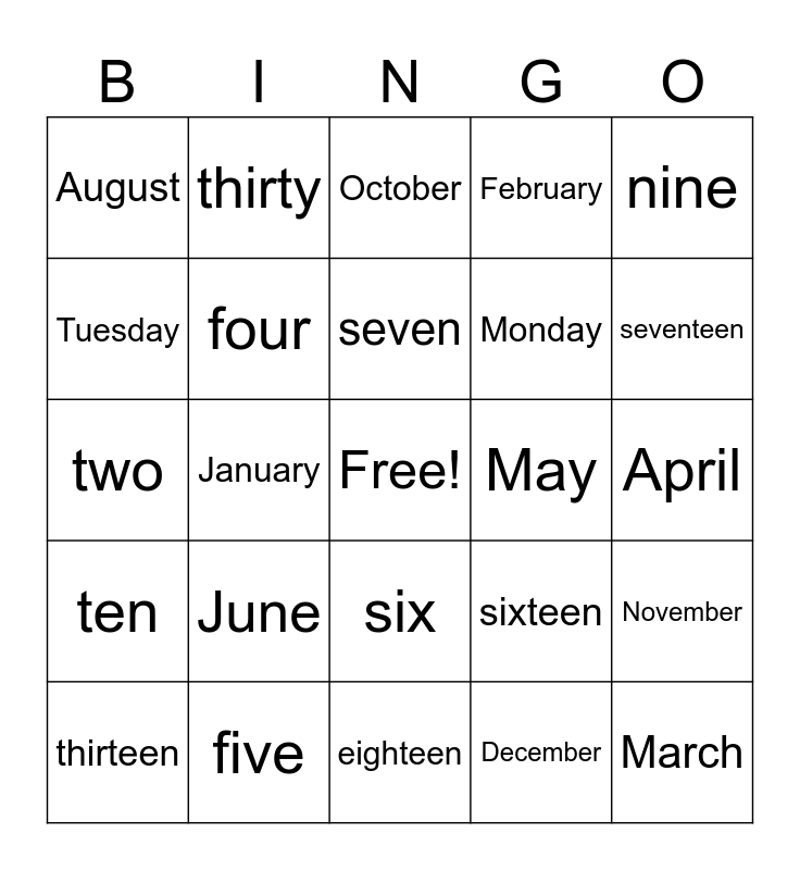 This bingo card has a free space and 40 words: one, two, three, four, five, six, seven, eight, nine, ten, January, February, March, April, May, June, July, August, September, October, November, December, Monday, Tuesday, Wednesday, Thursday, Friday, Saturday, Sunday, eleven, twelve, thirteen, fourteen, sixteen, seventeen, eighteen, nineteen, twenty, thirty and one hundred.