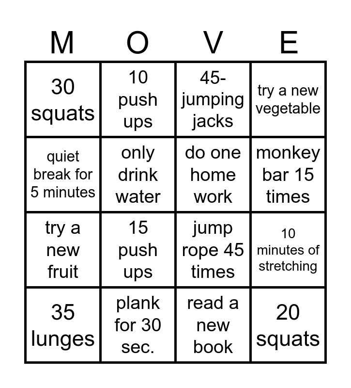 This bingo card has 16 words: plank for 30 sec., 10 minutes of stretching, 45- jumping jacks, 30 squats, try a new fruit, 10 push ups, jump rope 45 times, read a new book, quiet break for 5 minutes, only drink water, 35 lunges, try a new vegetable, 15 push ups, monkey bar 15 times, do one home work and 20 squats.