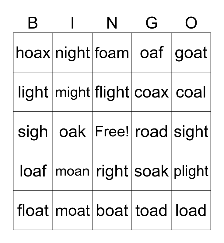 This bingo card has a free space and 24 words: moan, moat, flight, float, goat, hoax, light, night, road, right, coax, sigh, soak, plight, might, toad, sight, foam, coal, oak, load, loaf, oaf and boat.
