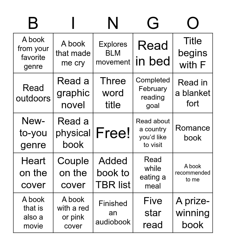 This bingo card has a free space and 24 words: Couple on the cover, A book with a red or pink cover, Three word title, A book that is also a movie, Title begins with F, A book from your favorite genre, Read outdoors, A book that made me cry, Read about a country you’d like to visit, Added book to TBR list, Completed February reading goal, New-to-you genre, Read while eating a meal, A book recommended to me, Read a graphic novel, Five star read, Romance book, Explores BLM movement, Read in a blanket fort, Read a physical book, A prize-winning book, Heart on the cover, Read in bed and Finished an audiobook.