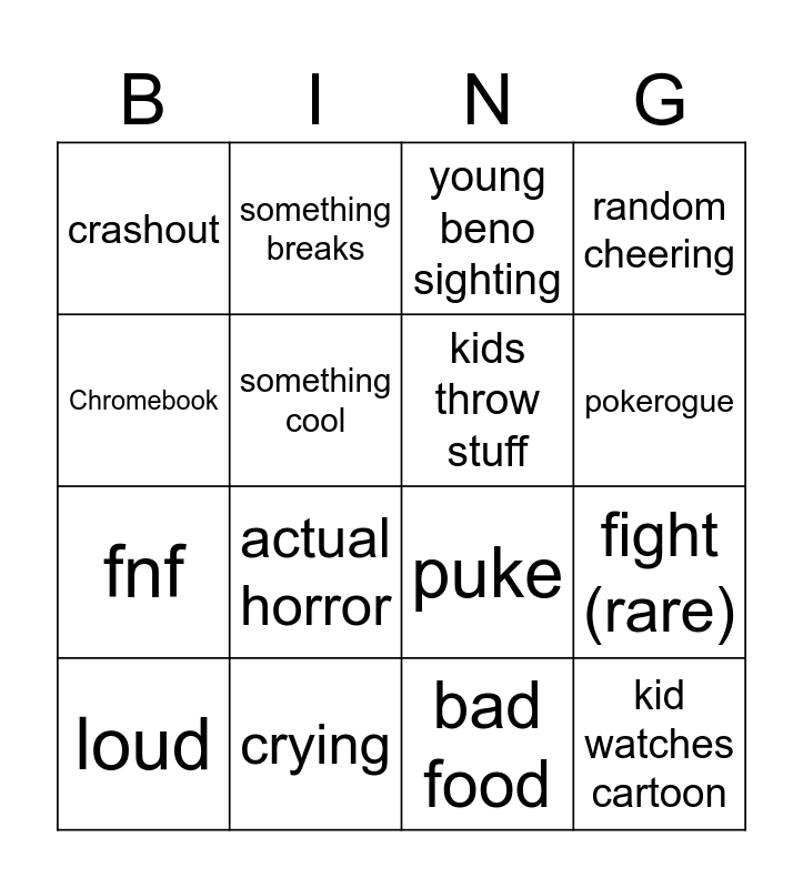 This bingo card has 16 words: crying, fight (rare), young beno sighting, crashout, fnf, something breaks, puke, bad food, Chromebook, something cool, loud, random cheering, actual horror, pokerogue, kids throw stuff and kid watches cartoon.