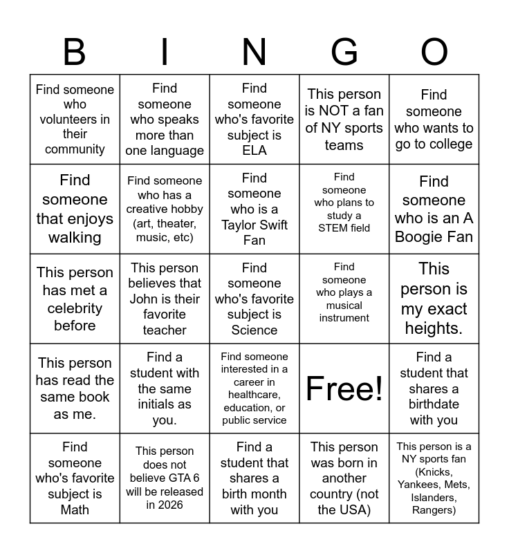 This bingo card has 25 words: Find a student with the same initials as you., Find a student that shares a birth month with you, Find someone who is a Taylor Swift Fan, Find someone who's favorite subject is Math, Find someone who wants to go to college, Find someone who volunteers in their community, Find someone that enjoys walking, Find someone who speaks more than one language, Find someone who plays a musical instrument, Find someone interested in a career in healthcare, education, or public service, Find someone who plans to study a STEM field, This person has met a celebrity before, Free!, Find a student that shares a birthdate with you, Find someone who has a creative hobby (art, theater, music, etc), This person is a NY sports fan (Knicks, Yankees, Mets, Islanders, Rangers), This person is my exact heights., Find someone who's favorite subject is ELA, Find someone who is an A Boogie Fan, This person believes that John is their favorite teacher, Find someone who's favorite subject is Science, This person does not believe GTA 6 will be released in 2026, This person has read the same book as me., This person is NOT a fan of NY sports teams and This person was born in another country (not the USA).