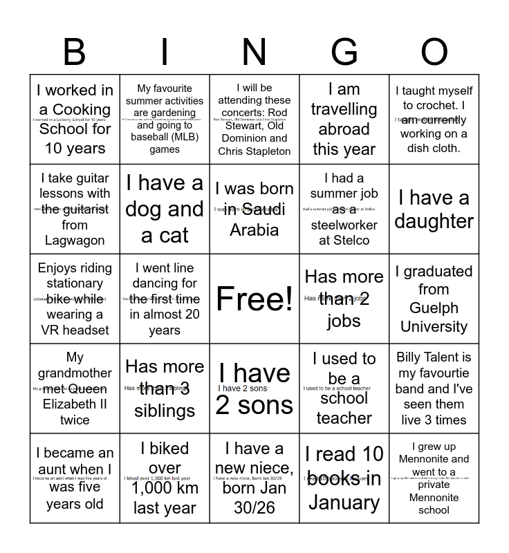 This bingo card has 19 images, a free space and 24 words: Has more than 3 siblings, I biked over 1,000 km last year, I was born in Saudi Arabia, I became an aunt when I was five years old, I taught myself to crochet. I am currently working on a dish cloth., I worked in a Cooking School for 10 years, I take guitar lessons with the guitarist from Lagwagon, My favourite summer activities are gardening and going to baseball (MLB) games, Has more than 2 jobs, I have 2 sons, I had a summer job as a steelworker at Stelco, Enjoys riding stationary bike while wearing a VR headset, I used to be a school teacher, Billy Talent is my favourtie band and I've seen them live 3 times, I have a dog and a cat, I read 10 books in January, I graduated from Guelph University, I will be attending these concerts: Rod Stewart, Old Dominion and Chris Stapleton, I have a daughter, I went line dancing for the first time in almost 20 years, I grew up Mennonite and went to a private Mennonite school, My grandmother met Queen Elizabeth II twice, I am travelling abroad this year and I have a new niece, born Jan 30/26.