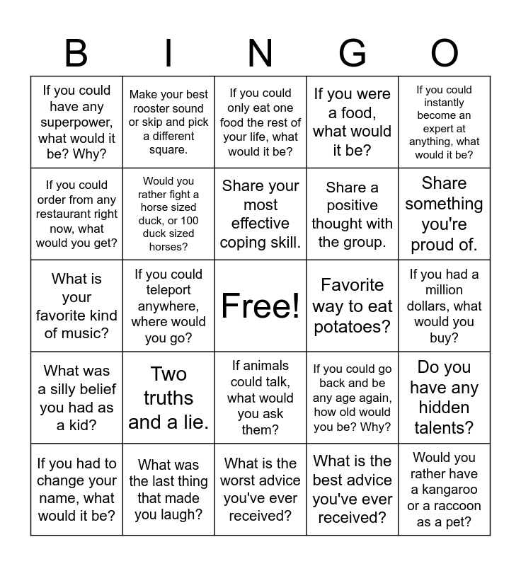This bingo card has a free space and 24 words: Two truths and a lie., What was the last thing that made you laugh?, Share your most effective coping skill., If you had to change your name, what would it be?, If you could instantly become an expert at anything, what would it be?, If you could have any superpower, what would it be? Why?, If you could order from any restaurant right now, what would you get?, Make your best rooster sound or skip and pick a different square., Favorite way to eat potatoes?, If animals could talk, what would you ask them?, Share a positive thought with the group., What is your favorite kind of music?, If you could go back and be any age again, how old would you be? Why?, Do you have any hidden talents?, Would you rather fight a horse sized duck, or 100 duck sized horses?, What is the best advice you've ever received?, If you had a million dollars, what would you buy?, If you could only eat one food the rest of your life, what would it be?, Share something you're proud of., If you could teleport anywhere, where would you go?, Would you rather have a kangaroo or a raccoon as a pet?, What was a silly belief you had as a kid?, If you were a food, what would it be? and What is the worst advice you've ever received?.