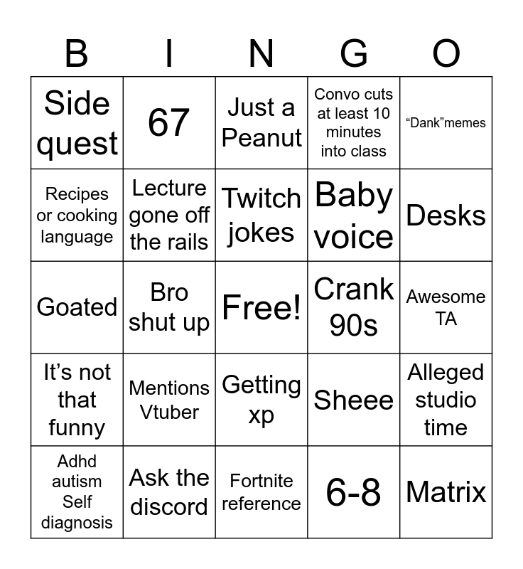 This bingo card has a free space and 24 words: Mentions Vtuber, Ask the discord, Twitch jokes, Adhd autism Self diagnosis, “Dank”memes, Side quest, Recipes or cooking language, 67, Crank 90s, Getting xp, Baby voice, Goated, Sheee, Alleged studio time, Lecture gone off the rails, 6-8, Awesome TA, Just a Peanut, Desks, Bro shut up, Matrix, It’s not that funny, Convo cuts at least 10 minutes into class and Fortnite reference.
