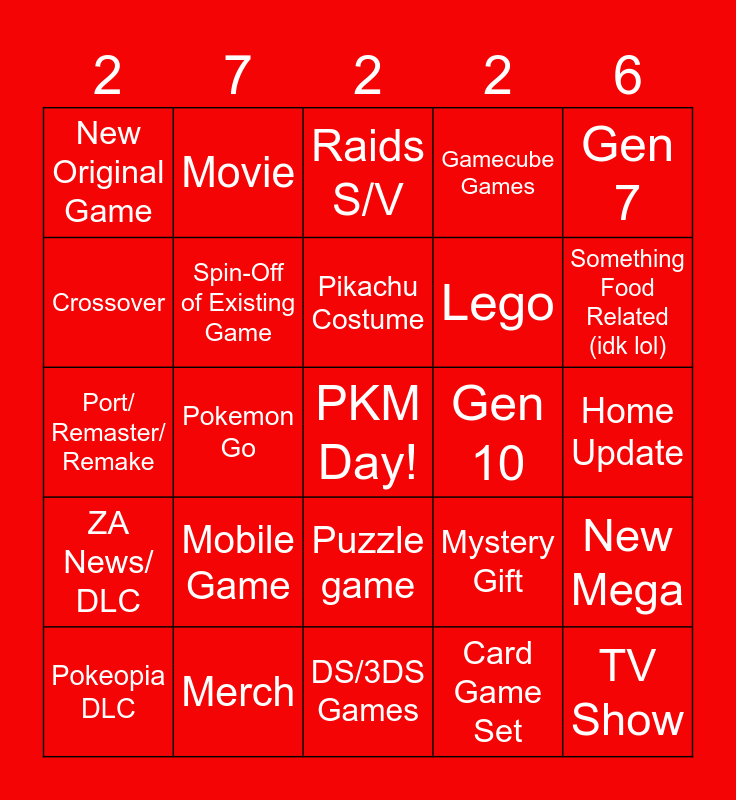 This bingo card has a free space and 24 words: Mobile Game, Merch, Pikachu Costume, Pokeopia DLC, Gen 7, New Original Game, Crossover, Movie, Gen 10, Puzzle game, Lego, Port/ Remaster/ Remake, Mystery Gift, New Mega, Spin-Off of Existing Game, Card Game Set, Home Update, Raids S/V, Something Food Related (idk lol), Pokemon Go, TV Show, ZA News/ DLC, Gamecube Games and DS/3DS Games.