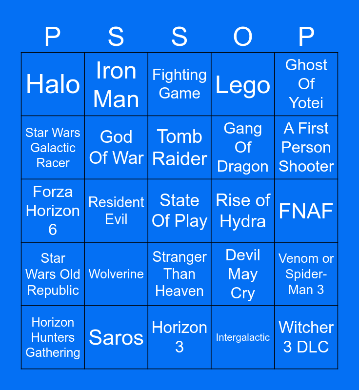 This bingo card has a free space and 24 words: Wolverine, Saros, Tomb Raider, Horizon Hunters Gathering, Ghost Of Yotei, Halo, Star Wars Galactic Racer, Iron Man, Rise of Hydra, Stranger Than Heaven, Gang Of Dragon, Forza Horizon 6, Devil May Cry, Venom or Spider-Man 3, God Of War, Intergalactic, FNAF, Fighting Game, A First Person Shooter, Resident Evil, Witcher 3 DLC, Star Wars Old Republic, Lego and Horizon 3.