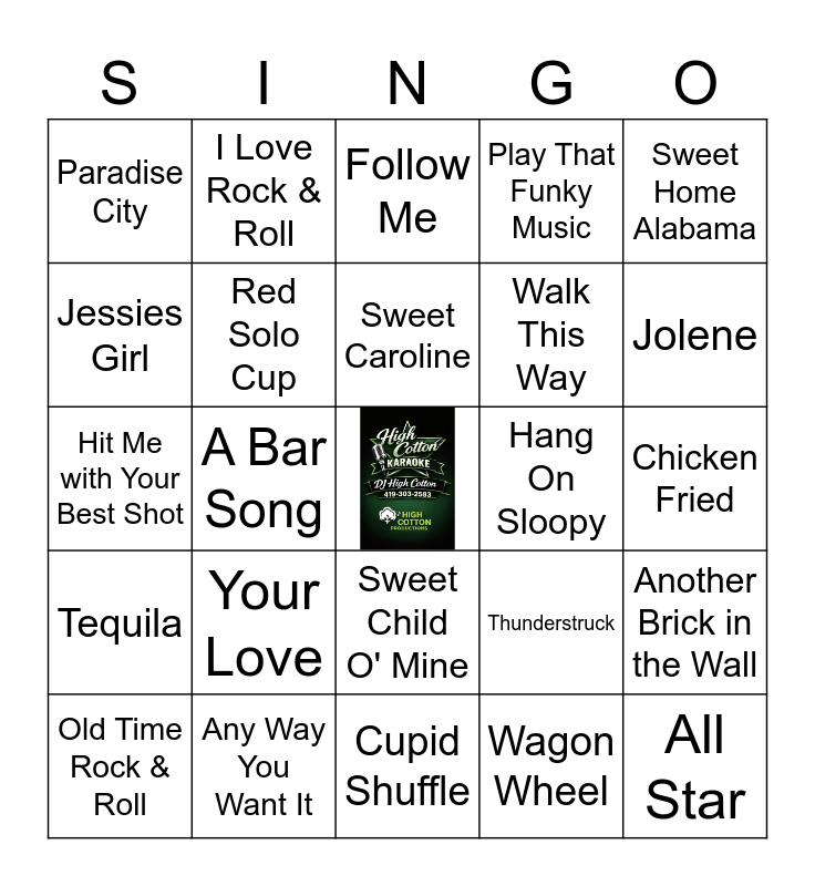 This bingo card has a free space and 24 words: Your Love, Any Way You Want It, Sweet Caroline, Old Time Rock & Roll, Sweet Home Alabama, Paradise City, Jessies Girl, I Love Rock & Roll, Hang On Sloopy, Sweet Child O' Mine, Walk This Way, Hit Me with Your Best Shot, Thunderstruck, Another Brick in the Wall, Red Solo Cup, Wagon Wheel, Chicken Fried, Follow Me, Jolene, A Bar Song, All Star, Tequila, Play That Funky Music and Cupid Shuffle.