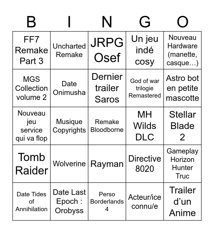 This bingo card has a free space and 24 words: Wolverine, Date Last Epoch : Orobyss, Dernier trailer Saros, Date Tides of Annihilation, Nouveau Hardware (manette, casque…), FF7 Remake Part 3, MGS Collection volume 2, Uncharted Remake, MH Wilds DLC, Rayman, God of war trilogie Remastered, Nouveau jeu service qui va flop, Directive 8020, Gameplay Horizon Hunter Truc, Date Onimusha, Acteur/ice connu/e, Stellar Blade 2, JRPG Osef, Astro bot en petite mascotte, Musique Copyrights, Trailer d’un Anime, Tomb Raider, Un jeu indé cosy and Perso Borderlands 4.