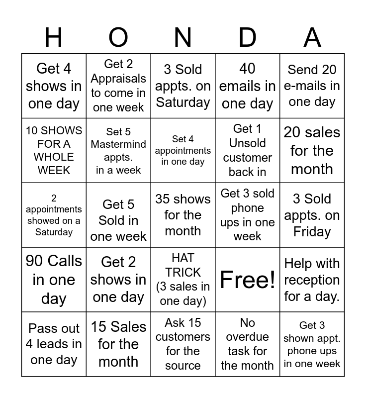 This bingo card has 25 words: Get 2 shows in one day, Ask 15 customers for the source, Set 4 appointments in one day, Pass out 4 leads in one day, Send 20 e-mails in one day, Get 4 shows in one day, 10 SHOWS FOR A WHOLE WEEK, Get 2 Appraisals to come in one week, Get 3 sold phone ups in one week, HAT TRICK (3 sales in one day), Get 1 Unsold customer back in, 2 appointments showed on a Saturday, Free!, Help with reception for a day., Set 5 Mastermind appts. in a week, Get 3 shown appt. phone ups in one week, 3 Sold appts. on Friday, 3 Sold appts. on Saturday, 20 sales for the month, Get 5 Sold in one week, 35 shows for the month, 15 Sales for the month, 90 Calls in one day, 40 emails in one day and No overdue task for the month.