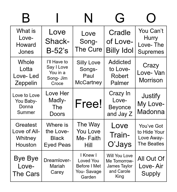 This bingo card has a free space and 76 words: Love Bites- Def Leopard, Heard it in a Love Song- The Marshall Tucker Band, Love Song- The Cure, Somebody to Love- Queen, Can’t Help Falling in Love- Elvis, Best of My Love- Eagles, I Love Rock ‘n’ Roll- Joan Jett, Can’t Buy Me Love- The Beatles, Love is a Battlefield- Pat Benatar, You Give Love a Bad Name- Bon Jovi, The Look of Love- ABC, Tainted Love- Soft Cell, Silly Love Songs- Paul McCartney, Whole Lotta Love- Led Zeppelin, I Want to Know What Love Is- Foreigner, Love Her Madly- The Doors, I’ll Never Fall in Love Again- Tom Jones, All Out Of Love- Air Supply, Only Love Can Break Your Heart- Neil Young, You Can’t Hurry Love- The Supremes, Feel Like Makin’ Love- Bad Company, Love to Love You Baby- Donna Summer, I’ll Have to Say I Love You in a Song- Jim Croce, Love Shack- B-52’s, Cradle of Love- Billy Idol, Endless Love- Lionel Richie and Diana Ross, I Just Called to Say I Love You- Stevie Wonder, True Love Ways- Buddy Holly, Modern Love- David Bowie, The One You Love- Glen Frey, Love Hurts- Nazareth, Why Can’t This Be Love- Van Halen, Love Me Like a Rock- Paul Simon, Love Train- O’Jays, Crazy Love- Van Morrison, Addicted to Love- Robert Palmer, The One I Love- R.E.M, No Ordinary Love- Sade, Justify My Love- Madonna, Will You Love Me Tomorrow- James Taylor and Carole King, Love Will Keep Us Together- The Captian and Tenille, Love in the First Degree- Alabama, Love in an Elevator- Aerosmith, Love in Vain- The Rolling Stones, I Think I Love You- The Patridge Family, Now Tha We Found Love- Heavy D, Bye Bye Love- The Cars, What is Love- Howard Jones, Love Will Tear Us Apart- Joy Division, It Must Be Love- Rick Derringer, The One That You Love- Air Supply, The Way You Love Me- Faith Hill, Love Don’t Cost a Thing- Jennifer Lopez, How Deep is Your Love- BeeGees, We Found Love- Rihanna, I’ll Make Love to You- Boyz ll Men, That’s The Way Love Goes- Janet Jackson, The Power of Love- Huey Lewis and The News, I Will Always Love You- Whitney Houston, Love Rollercoaster- Ohio Players, Where is the Love- Black Eyed Peas, Stupid Love- Lady Gaga, I’d Do Anything For Love- Meatloaf, Can You Feel the Love Tonight- Elton John, I Must Have Been Love- Roxette, Is This Love- Bob Marley, Crazy In Love- Beyonce and Jay Z, Love Story- Taylor Swift, Send My Love- Adele, Is This Love- Whitesnake, You’ve Got to Hide Your Love Away- The Beatles, Greatest Love of All- Whitney Houston, Dreamlover- Mariah Carey, I’d Really Love to See You See You Tonight- Seals and Croft, I Knew I Loved You Before I Met You- Savage Garden and Love My Way- Psychedelic Furs.