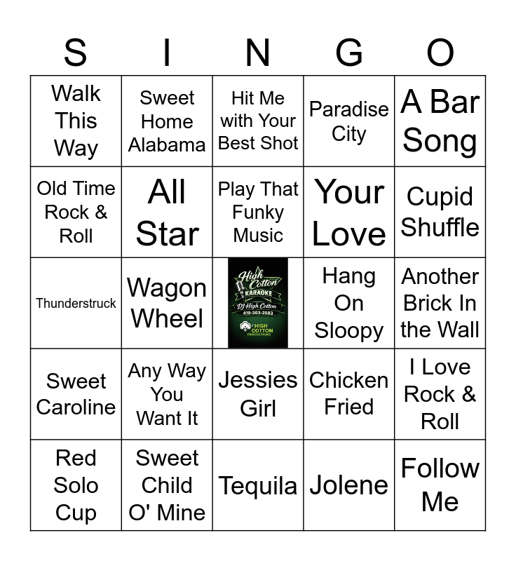 This bingo card has a free space and 24 words: Any Way You Want It, Sweet Child O' Mine, Play That Funky Music, Red Solo Cup, A Bar Song, Walk This Way, Old Time Rock & Roll, Sweet Home Alabama, Hang On Sloopy, Jessies Girl, Your Love, Thunderstruck, Chicken Fried, I Love Rock & Roll, All Star, Jolene, Another Brick In the Wall, Hit Me with Your Best Shot, Cupid Shuffle, Wagon Wheel, Follow Me, Sweet Caroline, Paradise City and Tequila.
