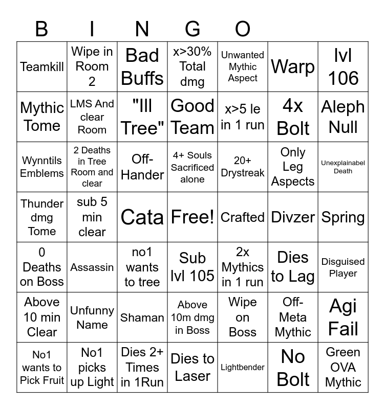 This bingo card has a free space and 48 words: Wipe on Boss, 4x Bolt, Dies to Laser, sub 5 min clear, Off-Hander, Spring, Wipe in Room 2, No1 picks up Light, Warp, Sub lvl 105, lvl 106, x>30% Total dmg, Only Leg Aspects, 20+ Drystreak, Above 10 min Clear, Divzer, Mythic Tome, Aleph Null, Off-Meta Mythic, Unwanted Mythic Aspect, x>5 le in 1 run, Cata, Teamkill, LMS And clear Room, Agi Fail, "Ill Tree", Unexplainabel Death, No1 wants to Pick Fruit, 4+ Souls Sacrificed alone, 2 Deaths in Tree Room and clear, No Bolt, Crafted, Disguised Player, Unfunny Name, Thunder dmg Tome, 2x Mythics in 1 run, Dies to Lag, Wynntils Emblems, no1 wants to tree, Shaman, 0 Deaths on Boss, Green OVA Mythic, Bad Buffs, Dies 2+ Times in 1Run, Good Team, Above 10m dmg in Boss, Assassin and Lightbender.