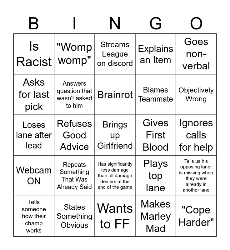 This bingo card has a free space and 24 words: Repeats Something That Was Already Said, States Something Obvious, Brainrot, Tells someone how their champ works, Goes non-verbal, Is Racist, Asks for last pick, "Womp womp", Gives First Blood, Has significantly less damage than all damage dealers at the end of the game, Blames Teammate, Loses lane after lead, Plays top lane, Tells us his opposing laner is missing when they were already in another lane, Answers question that wasn't asked to him, Makes Marley Mad, Ignores calls for help, Streams League on discord, Objectively Wrong, Refuses Good Advice, "Cope Harder", Webcam ON, Explains an Item and Wants to FF.