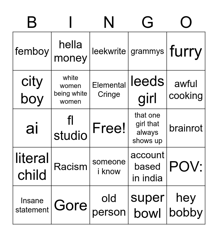 This bingo card has a free space and 24 words: Racism, Gore, Elemental Cringe, Insane statement, furry, femboy, city boy, hella money, that one girl that always shows up, someone i know, leeds girl, ai, account based in india, POV:, white women being white women, super bowl, brainrot, leekwrite, awful cooking, fl studio, hey bobby, literal child, grammys and old person.