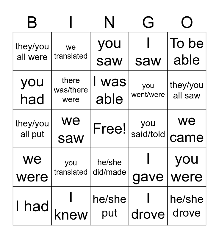 This bingo card has a free space and 90 words: I did/made, you did/made, he/she did/made, we did/made, they/you all did/made, I wanted, you wanted, he/she wanted, we wanted, they/you all wanted, I came, you came, he/she came, we came, they/you all came, I was able, you were able, he/she was able, we were able, they/you all were able, I put, you put, he/she put, we put, they/you all put, I knew, you knew, he/she knew, we knew, they/you all knew, I was, you were, he/she was, we were, they/you all were, I saw, you saw, he/she saw, we saw, they/you all saw, I had, you had, he/she had, we had, they/you all had, I gave, you gave, he/she gave, we gave, they/you all gave, I went/was, you went/were, he/she went/was, we went/were, they/you all went/were, I said/told, you said/told, he/she said/told, we said/told, they/you all said/told, I brought, you brought, he/she brought, we brought, they/you all brought, they/you all drove, they/you all translated, I drove, I translated, you drove, you translated, he/she drove, he/she translated, we drove, we translated, there was/there were, To have, To be (temporary), To go, To be (permanent), To put, To be able, To bring, To make/do, To know, To want, To say/tell, To come, To see and To give.