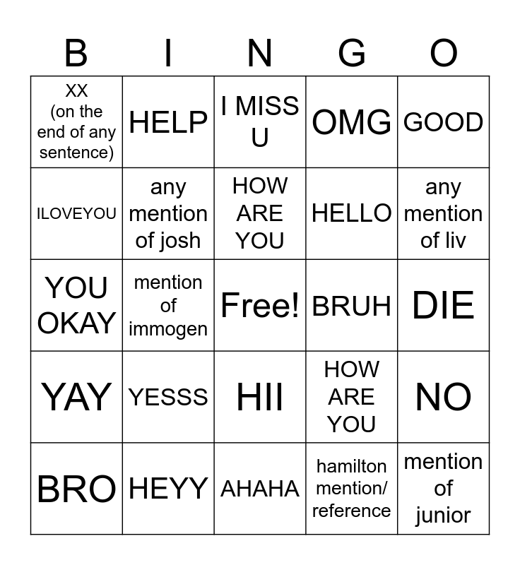 This bingo card has a free space and 24 words: YESSS, HEYY, HOW ARE YOU, BRO, GOOD, XX (on the end of any sentence), ILOVEYOU, HELP, BRUH, HII, HELLO, YOU OKAY, HOW ARE YOU, NO, any mention of josh, hamilton mention/ reference, DIE, I MISS U, any mention of liv, mention of immogen, mention of junior, YAY, OMG and AHAHA.