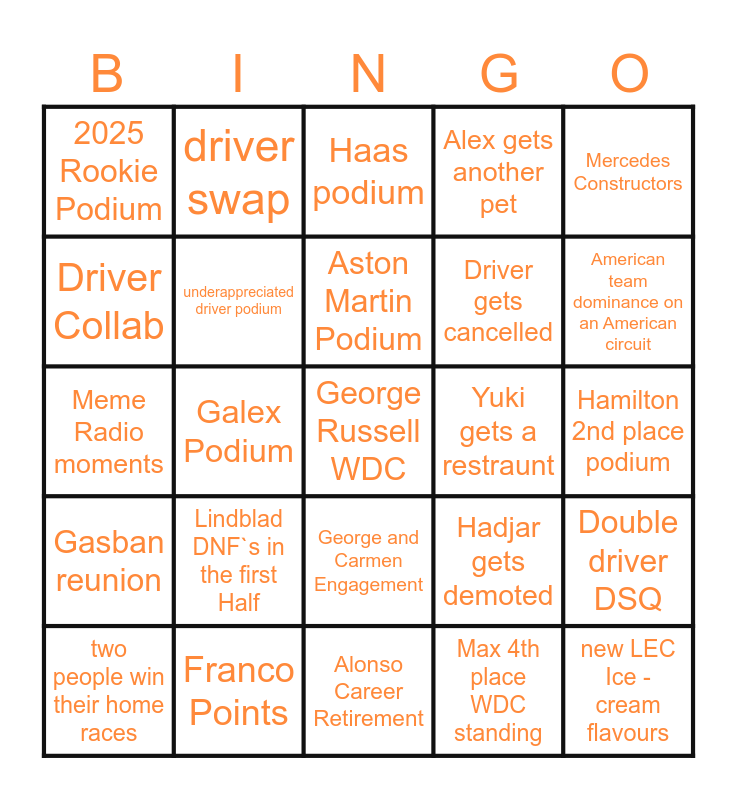 This bingo card has a free space and 24 words: Lindblad DNF`s in the first Half, Franco Points, Aston Martin Podium, two people win their home races, Mercedes Constructors, 2025 Rookie Podium, Driver Collab, driver swap, Yuki gets a restraunt, George and Carmen Engagement, Driver gets cancelled, Meme Radio moments, Hadjar gets demoted, Double driver DSQ, underappreciated driver podium, Max 4th place WDC standing, Hamilton 2nd place podium, Haas podium, American team dominance on an American circuit, Galex Podium, new LEC Ice -cream flavours, Gasban reunion, Alex gets another pet and Alonso Career Retirement.