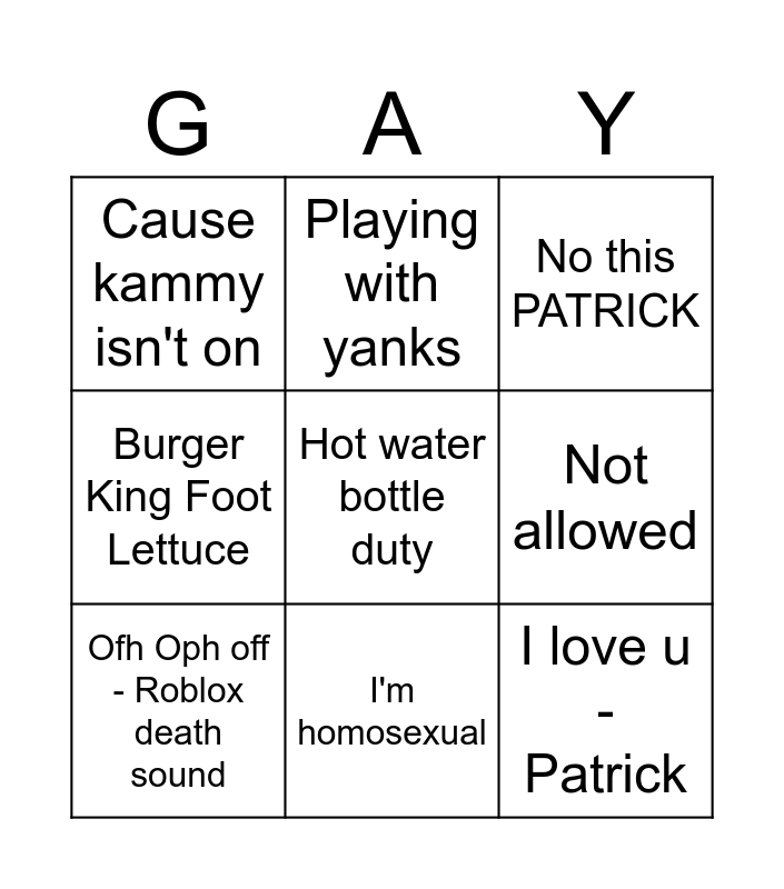 This bingo card has 24 words: I enjoy spending time with Ciera, Almost Valentine's Day, I'm homosexual, Foot Rubs, Hot water bottle duty, Cause kammy isn't on, Not allowed, Playing with yanks, Mum is looking after him, Hot water bottle duty, I love u -Patrick, Nope -Enganerer, Mine song, Nani!?!?!?!?, Ofh Oph off - Roblox death sound, Wii sports bowling/ Opening, Shooting stars, No this PATRICK, All star, Spell Icup, lelelelelelele -Patrick, Somebody tocha my spaget, Burger King Foot Lettuce and I have fallen and can't get up.