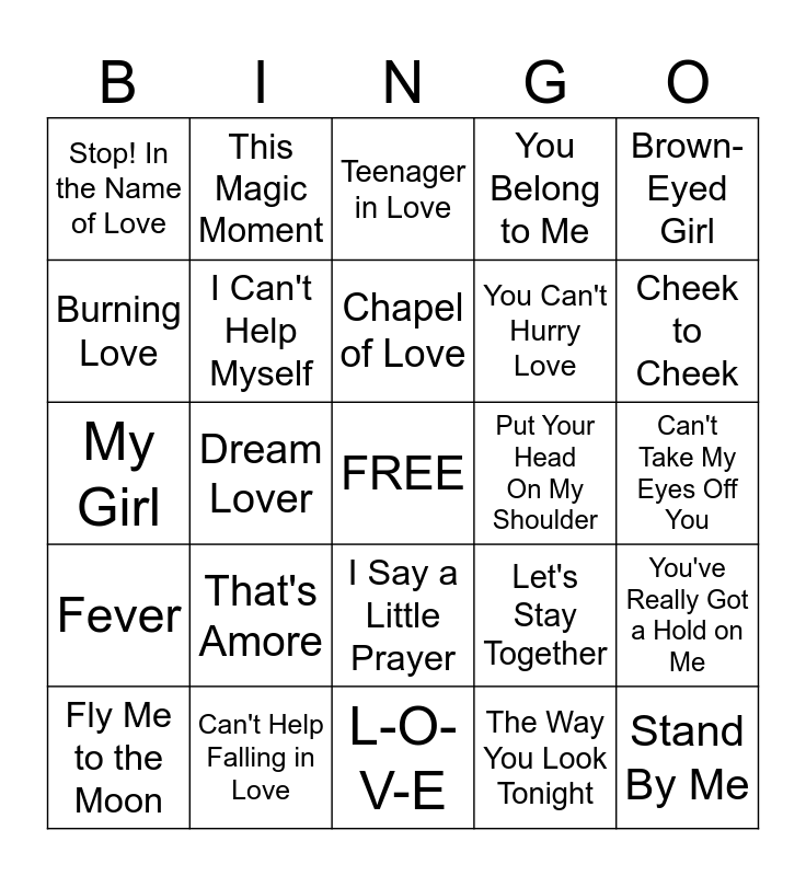 This bingo card has a free space and 29 words: Fly Me to the Moon, At Last, Dream Lover, I Got You Babe, Stop! In the Name of Love, Teenager in Love, I Can't Help Myself, That's Amore, Put Your Head On My Shoulder, Can't Help Falling in Love, Can't Take My Eyes Off You, Stand By Me, L-O-V-E, The Way You Look Tonight, Cheek to Cheek, Un-forgettable, I Say a Little Prayer, Fever, Brown-Eyed Girl, My Girl, Let's Stay Together, Happy Together, You Can't Hurry Love, Burning Love, You Belong to Me, This Magic Moment, You've Really Got a Hold on Me, Chapel of Love and Save the Last Dance for Me.