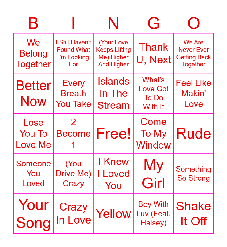 This bingo card has a free space and 201 words: My Heart Will Go On, Achy Brakey Heart, My Funny Valentine, Perfect, Marry Me, All Of Me, Make You Feel My Love, I Just Called To Say I Love You, Can't Help Falling In Love, What's Love Got To Do With It, Love The Way You Lie, It Must Have Been Love, Crazy Littel Thing Called Love, Speechless, In Case You Didnt Know, 10,000 Hours, God Gave Me You, I’m Gonna Love You, Beautiful Things, Bloodline, What I Want, Fate Of Ophelia, Tennessee Whiskey, Butterflies, Crazy In Love, Sunday Morning, Lover, Stand By Me, My Girl, Unchained Melody, Lets Stay Together, Your Song, The Way You Look Tonight, L-O-V-E, Can't Help Falling In Love, At Last, The Art Of Loving, Apt, Azizam, Ordinary, Yummy, How Deep Is Your Love, I Will Survive, Since U Been Gone, Nothing Compares 2 U, Somone Like You, Irreplaceable, So What, Don't Speak, Go Your Own Way, We Are Never Ever Getting Back Together, Thank U, Next, Lose You To Love Me, Someone You Loved, Fake Love, Boy With Luv (Feat. Halsey), Kisses, I Fall Apart, Lucid Dreams, Without You, Memories, Feel So Close, Innerbloom, Paris, Roses, I Want To Know What Love Is, Man I Need, An Old Fashioned Love Song, White Horse, Hold On We're Going Home, Flashing Lights, Sunflower, Better Now, God Only Knows, Take My Breath Away, Saving All My Love, Yellow, Kiss Me, Dilemma, Sucker, We Belong Together, Adore You, You Make My Dreams Come True, Lovefool, By Your Side, Islands In The Stream, Shape Of My Heart, I Want You Back, Cherish, If You Had My Love, Tearin’ Up My Heart, Step By Step, Genie In A Bottle, Fantasy, 2 Become 1, Wannabe, (You Drive Me) Crazy, As Long As You Love Me, Always Be My Baby, The Sign, Show Me Love, She's Always A Woman, Bob Mosses, Walking On Broken Glass, I Want You, Rude, She Will Be Loved, Love Hurts, (Your Love Keeps Lifting Me) Higher And Higher, Bring It On Home To Me, Beth, When Something Is Wrong With My Baby, Every Time You Go Away, Kiss On My List, Purple Rain, Addicted To Love, Open Arms, Don't Want To Miss A Thing, Love Somebody, Romeo And Juliette, The Flame, Heaven, Right Down The Line, Just The Way You Are, Come To My Window, I Drove All Night, Maybe I'm Amazed, All You Need Is Love, I Can't Help Falling In Love With You, Suspicious Minds, Something, Happy Together, Stuck With You, Just Like Heaven, One, Can't Fight This Feeling Anymore, Feel Like Makin' Love, With Or Without You, I Want You To Want Me, When It's Love, Time After Time, Faithfully, Lady In Red, Something So Strong, Don't You (Forget About Me), I'd Do Anything For Love, (Make Me Do) Anything You Want, Love Song, I Remember You, Ain't Talkin' 'Bout Love, In My Dreams, I'll Be There For You, Never Let You Go, To Be With You, Is This Love?, Love Ain't No Stranger, I Believe In A Thing Called Love, Love Is Only A Feeling, She's Gone, Permission To Dance, Gangnam Style, Dynamite, Nothing's Gonna Stop Us Now, Golden, From The Start, Island In The Sun, Will You Love Me Tomorrow, I'll Be There, You Got It All, Bad, Black Or White, Motownphily, Water Runs Dry, Freedom! '90, This Is How We Do It, Don't Be Cruel, Home, Human Nature, Never Gonna Give You Up, I Think We're Alone Now, The Fate Of Ophelia, Giving Her Away, What Do You Mean?, Espresso, Butter, Shake It Off, Flowers, I Knew I Loved You, Bye Bye Bye, Its Gonna Be Me, I Want It That Way, Single Ladies (Put A Ring On It), Every Breath You Take, I Still Haven't Found What I'm Looking For, Brown Eyed Girl, Where Did Our Love Go, You Can't Hurry Love, Easy On Me, Shallow, I Will Always Love You and Can't Get You Out Of My Head.