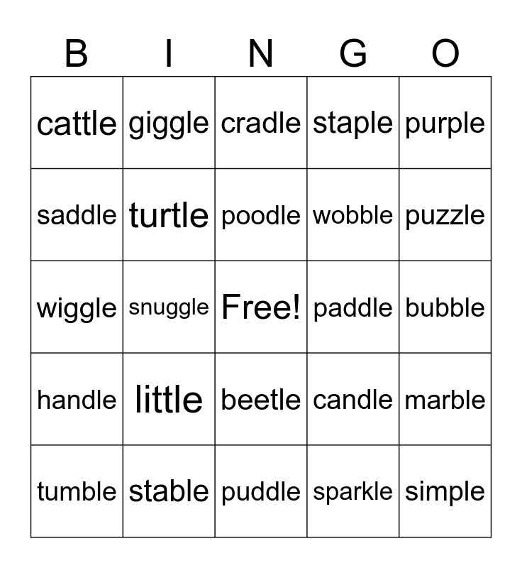 This bingo card has a free space and 25 words: little, puddle, poodle, tumble, purple, cattle, saddle, giggle, paddle, beetle, wobble, wiggle, candle, marble, turtle, table, bubble, cradle, puzzle, snuggle, simple, stable, handle, staple and sparkle.