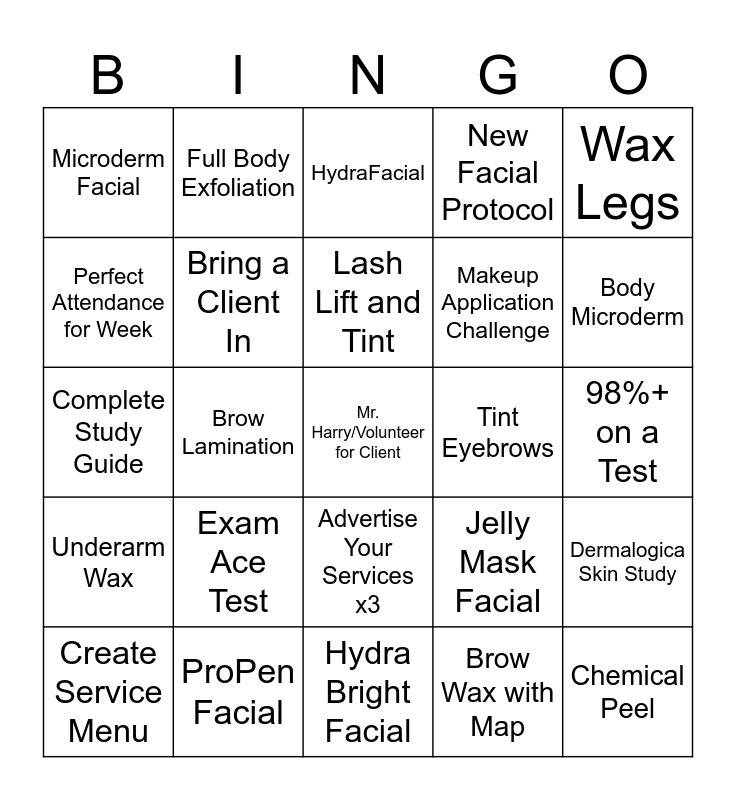 This bingo card has a free space and 24 words: Exam Ace Test, ProPen Facial, Lash Lift and Tint, Create Service Menu, Wax Legs, Microderm Facial, Perfect Attendance for Week, Full Body Exfoliation, Tint Eyebrows, Advertise Your Services x3, Makeup Application Challenge, Complete Study Guide, Jelly Mask Facial, Dermalogica Skin Study, Bring a Client In, Brow Wax with Map, 98%+ on a Test, HydraFacial, Body Microderm, Brow Lamination, Chemical Peel, Underarm Wax, New Facial Protocol and Hydra Bright Facial.