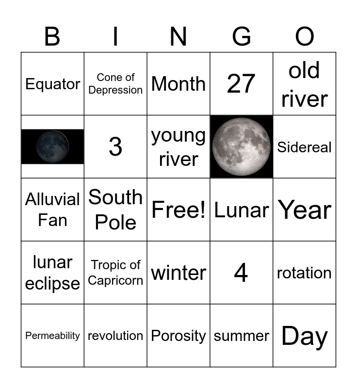 This bingo card has 4 images, a free space and 32 words: solar eclipse, 1, 2, 3, 4, lunar eclipse, young river, mature river, old river, North Pole, South Pole, 27, 29, Lunar, Sidereal, Equator, Tropic of Cancer, Tropic of Capricorn, Day, Month, Year, rotation, revolution, Permeability, Porosity, Cone of Depression, Alluvial Fan, latitude, summer, winter, tilt of axis and counterclockwise.