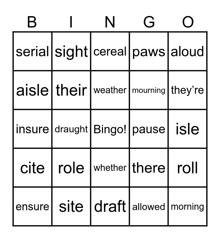 This bingo card has a free space and 24 words: role, site, weather, ensure, aloud, serial, aisle, sight, pause, whether, mourning, insure, there, roll, their, allowed, isle, cereal, they’re, draught, morning, cite, paws and draft.