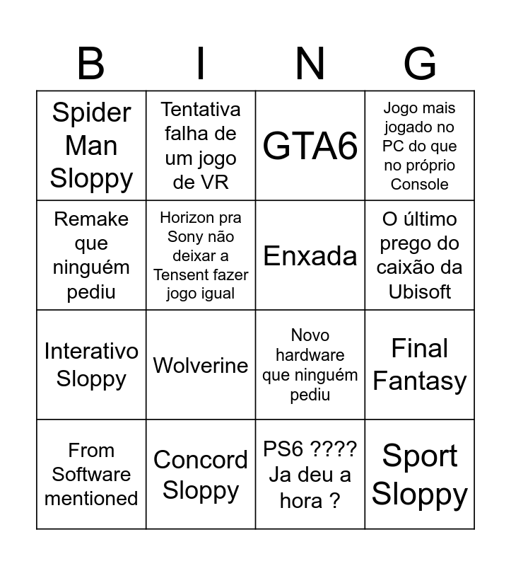 This bingo card has 16 words: Concord Sloppy, Final Fantasy, GTA6, Spider Man Sloppy, Interativo Sloppy, Tentativa falha de um jogo de VR, Novo hardware que ninguém pediu, PS6 ???? Ja deu a hora ?, Remake que ninguém pediu, Horizon pra Sony não deixar a Tensent fazer jogo igual, From Software mentioned, Jogo mais jogado no PC do que no próprio Console, Wolverine, O último prego do caixão da Ubisoft, Enxada and Sport Sloppy.