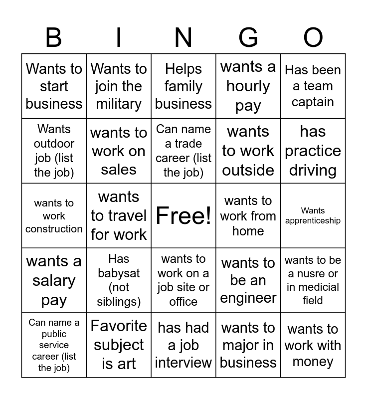 This bingo card has a free space and 24 words: Has babysat (not siblings), Favorite subject is art, Can name a trade career (list the job), Can name a public service career (list the job), Has been a team captain, Wants to start business, Wants outdoor job (list the job), Wants to join the military, wants to work from home, wants to work on a job site or office, wants to work outside, wants to work construction, wants to be an engineer, wants to be a nusre or in medicial field, wants to work on sales, wants to major in business, Wants apprenticeship, Helps family business, has practice driving, wants to travel for work, wants to work with money, wants a salary pay, wants a hourly pay and has had a job interview.