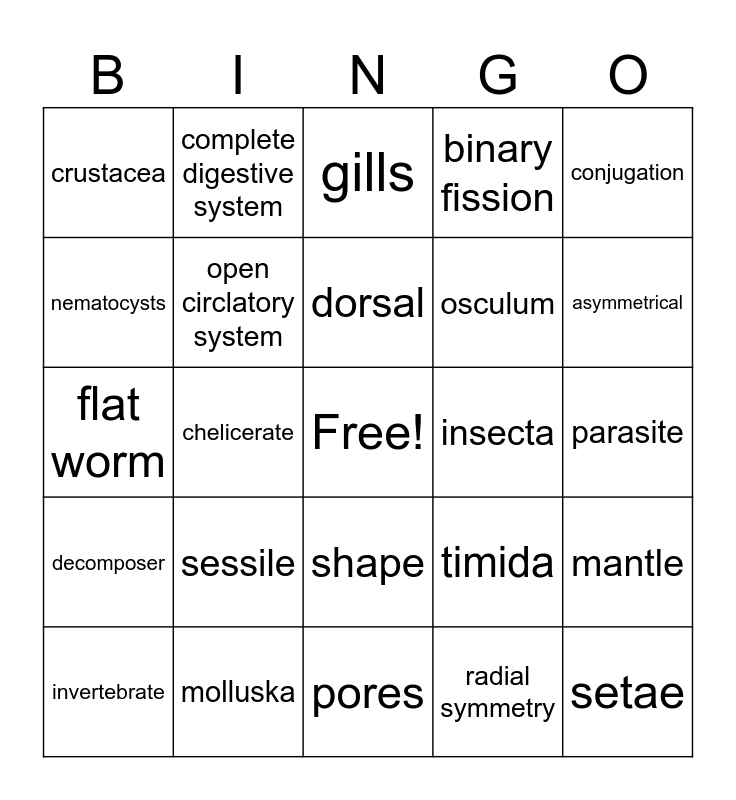 This bingo card has a free space and 29 words: invertebrate, posteriror, chelicerate, spicules, crustacea, gills, open circlatory system, sessile, insecta, molluska, parasite, setae, pores, radial symmetry, asymmetrical, oral arms, shape, decomposer, conjugation, flat worm, timida, clitellum, osculum, nematocysts, binary fission, complete digestive system, mantle, dorsal and cephalothorax.