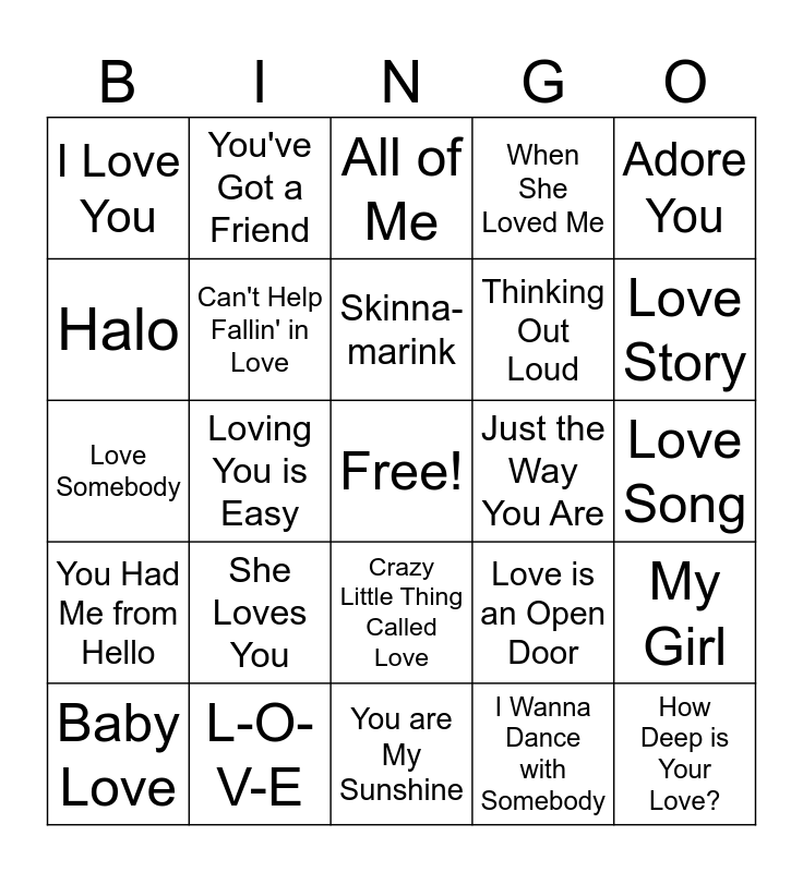 This bingo card has a free space and 24 words: She Loves You, L-O-V-E, Skinna- marink, Baby Love, Adore You, I Love You, Halo, You've Got a Friend, Just the Way You Are, Crazy Little Thing Called Love, Thinking Out Loud, Love Somebody, Love is an Open Door, My Girl, Can't Help Fallin' in Love, I Wanna Dance with Somebody, Love Song, All of Me, Love Story, Loving You is Easy, How Deep is Your Love?, You Had Me from Hello, When She Loved Me and You are My Sunshine.