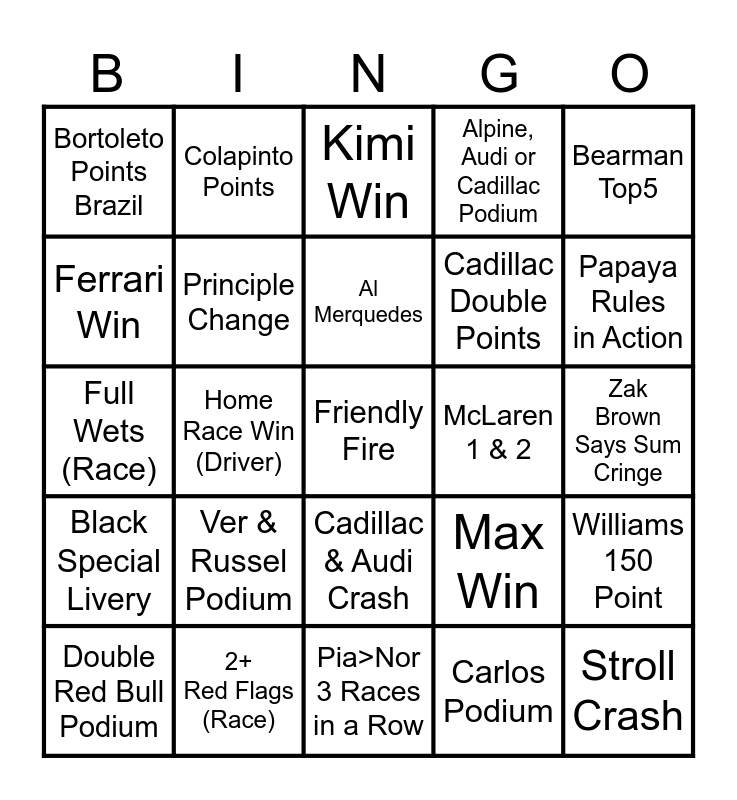 This bingo card has 25 words: Ver & Russel Podium, Pia>Nor 3 Races in a Row, Al Merquedes, Double Red Bull Podium, Bearman Top5, Bortoleto Points Brazil, Ferrari Win, Colapinto Points, McLaren 1 & 2, Cadillac & Audi Crash, Cadillac Double Points, Full Wets (Race), Max Win, Williams 150 Point, Principle Change, Stroll Crash, Zak Brown Says Sum Cringe, Kimi Win, Papaya Rules in Action, Home Race Win (Driver), Friendly Fire, 2+ Red Flags (Race), Black Special Livery, Alpine, Audi or Cadillac Podium and Carlos Podium.