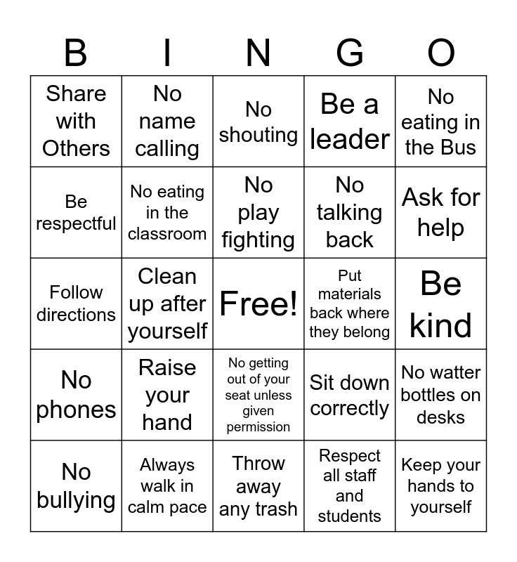 This bingo card has a free space and 24 words: Raise your hand, Always walk in calm pace, No play fighting, No bullying, No eating in the Bus, Share with Others, Be respectful, No name calling, Put materials back where they belong, No getting out of your seat unless given permission, No talking back, Follow directions, Sit down correctly, No watter bottles on desks, No eating in the classroom, Respect all staff and students, Be kind, No shouting, Ask for help, Clean up after yourself, Keep your hands to yourself, No phones, Be a leader and Throw away any trash.