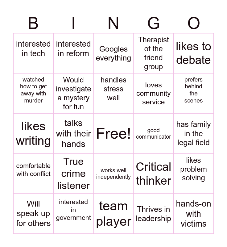 This bingo card has a free space and 24 words: True crime listener, interested in government, handles stress well, Will speak up for others, likes to debate, interested in tech, watched how to get away with murder, interested in reform, good communicator, works well independently, loves community service, likes writing, Critical thinker, likes problem solving, Would investigate a mystery for fun, Thrives in leadership, has family in the legal field, Googles everything, prefers behind the scenes, talks with their hands, hands-on with victims, comfortable with conflict, Therapist of the friend group and team player.