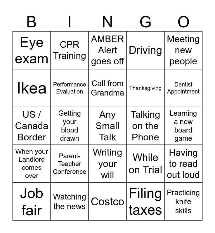 This bingo card has 36 words: Funeral, SAT, Interview, Performance Evaluation, While on Trial, When your Landlord comes over, Call from Grandma, Giving a Sermon, Meeting new people, Airport Security, Getting your blood drawn, Driving, Breaking Up w/ SO, Talking on the Phone, Dentist Appointment, Eye exam, Practicing knife skills, Parent-Teacher Conference, Any Small Talk, AMBER Alert goes off, Learning a new board game, Having to read out loud, Watching the news, Job fair, Costco, CPR Training, US / Canada Border, At your partner’s family’s, Thanksgiving, Ikea, Hospital waiting room, Any icebreaker event, Filing taxes, Writing your will, Middle seat on a plane and Fire alarm goes off.
