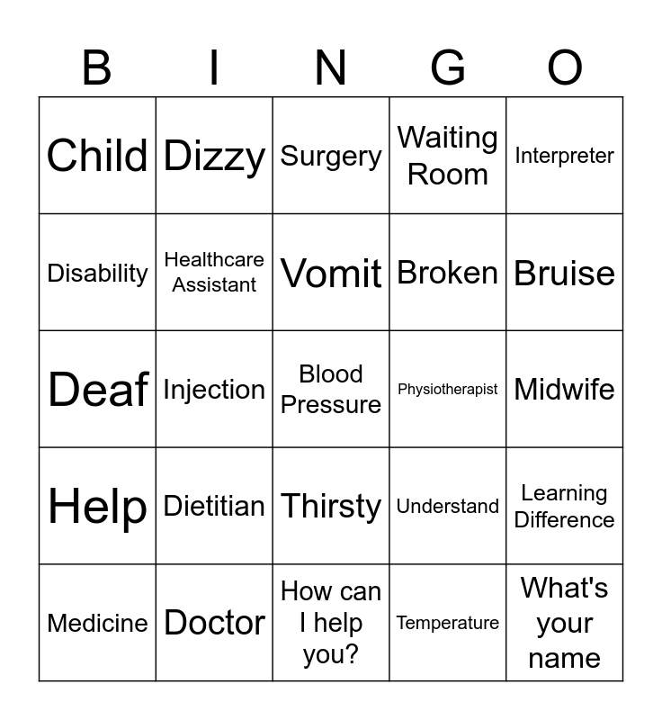 This bingo card has a free space and 29 words: Medicine, Pain, Injection, Toy, Child, Surgery, Healthcare Assistant, Dietitian, Physiotherapist, Doctor, Midwife, What's your name, How can I help you?, Temperature, Bruise, ADHD, Thirsty, Help, Interpreter, Deaf, Understand, NHS, Broken, Disability, Waiting Room, Dizzy, Learning Difference, Vomit and Ward.
