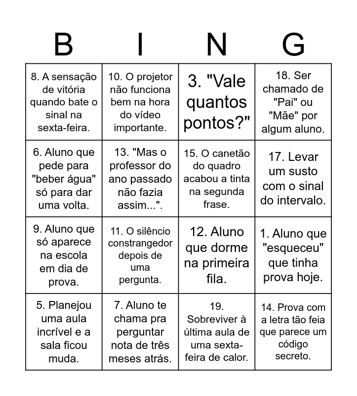 This bingo card has 20 words: 1. Aluno que "esqueceu" que tinha prova hoje., 2. "Pode fazer em dupla de três?", 3. "Vale quantos pontos?", 4. Aluno faz a prova em 5 min e diz "tava fácil" (errou tudo)., 5. Planejou uma aula incrível e a sala ficou muda., 6. Aluno que pede para "beber água" só para dar uma volta., 7. Aluno te chama pra perguntar nota de três meses atrás., 8. A sensação de vitória quando bate o sinal na sexta-feira., 9. Aluno que só aparece na escola em dia de prova., 10. O projetor não funciona bem na hora do vídeo importante., 11. O silêncio constrangedor depois de uma pergunta., 12. Aluno que dorme na primeira fila., 13. "Mas o professor do ano passado não fazia assim..."., 14. Prova com a letra tão feia que parece um código secreto., 15. O canetão do quadro acabou a tinta na segunda frase., 16. "O que é pra fazer?" um segundo depois de você explicar., 17. Levar um susto com o sinal do intervalo., 18. Ser chamado de "Pai" ou "Mãe" por algum aluno., 19. Sobreviver à última aula de uma sexta-feira de calor. and 20. Entrar na sala dos profes e ver que alguém trouxe bolo..