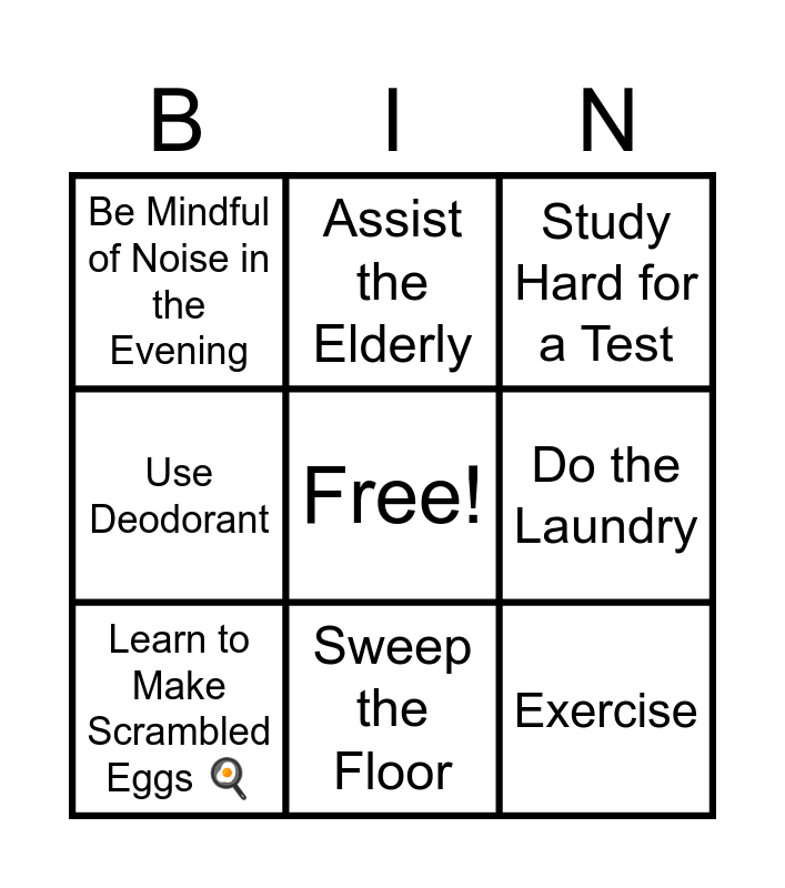 This bingo card has a free space and 8 words: Do the Laundry, Study Hard for a Test, Assist the Elderly, Learn to Make Scrambled Eggs 🍳, Be Mindful of Noise in the Evening, Exercise, Use Deodorant and Sweep the Floor.