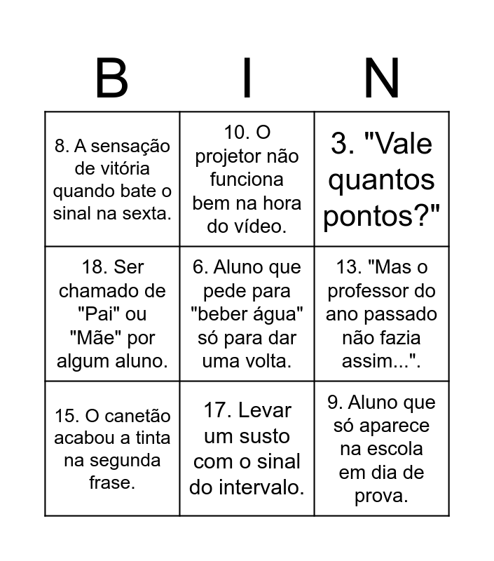 This bingo card has 20 words: 1. Aluno que "esqueceu" que tinha prova hoje., 2. "Pode fazer em dupla de três?", 3. "Vale quantos pontos?", 4. Aluno faz prova em 5 min e diz "fácil" (errou tudo)., 5. Planejou uma aula incrível e a sala ficou muda., 6. Aluno que pede para "beber água" só para dar uma volta., 7. Aluno te chama pra perguntar nota de três meses atrás., 8. A sensação de vitória quando bate o sinal na sexta., 9. Aluno que só aparece na escola em dia de prova., 10. O projetor não funciona bem na hora do vídeo., 11. O silêncio constrangedor depois de uma pergunta., 12. Aluno que dorme na primeira fila., 13. "Mas o professor do ano passado não fazia assim..."., 14. Prova com letra tão feia que parece um código secreto., 15. O canetão acabou a tinta na segunda frase., 16. "O que é pra fazer?" um seg depois de você explicar., 17. Levar um susto com o sinal do intervalo., 18. Ser chamado de "Pai" ou "Mãe" por algum aluno., 19. Sobreviver à última aula de uma sexta-feira de calor. and 20. Entrar na sala dos profes e ver q alguém trouxe bolo..